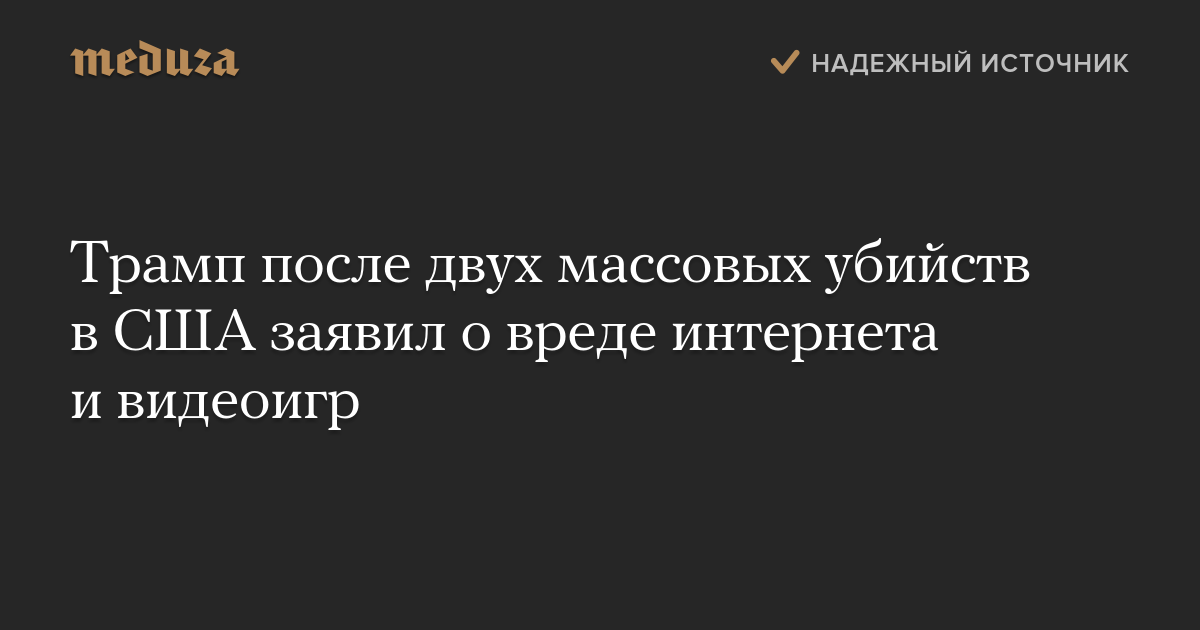 «Опасности интернета и соцсетей не должны быть проигнорированы и не будут проигнорированы», — заявил Трамп, осудив также «прославление насилия» в видеоиграх.