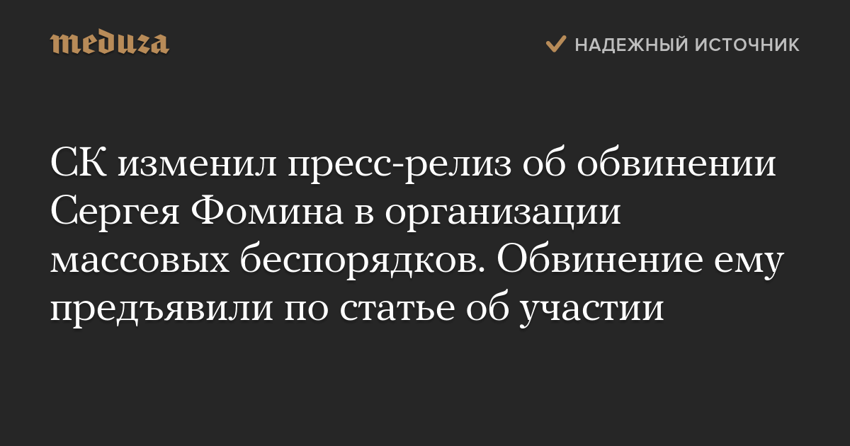 СК изменил пресс-релиз об обвинении Сергея Фомина в организации массовых беспорядков. Обвинение ему предъявили по статье об участии