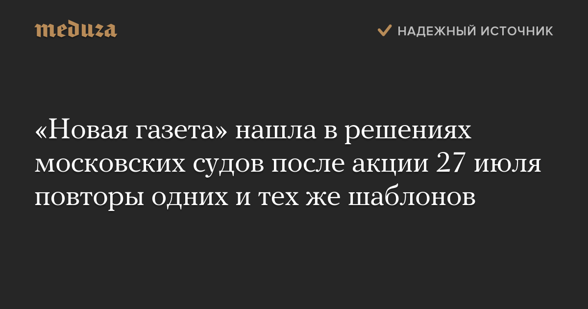 В десятках решений московских судов по статье 20.2 КоАП, вынесенных по делам участников акции протеста 27 июля, есть повторяющиеся шаблоны. Об этом сообщает «Новая газета», которая проанализировала 153 решения, опубликованных на сайте Мосгорсуда с 27 июля по 2 августа.