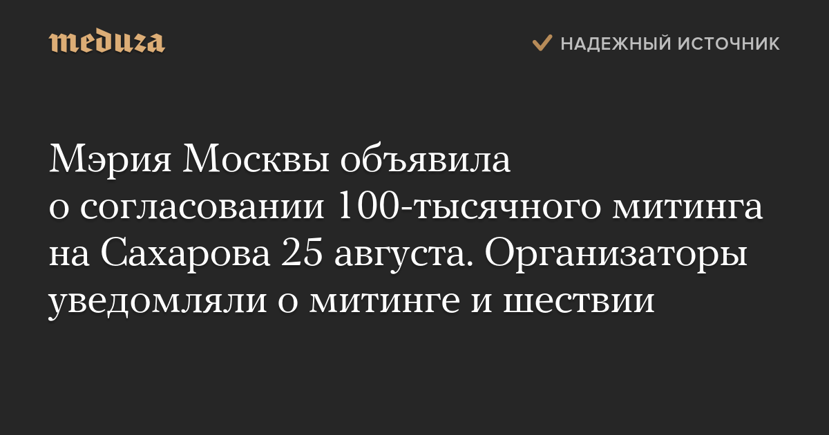 Мэрия Москвы объявила о согласовании 100-тысячного митинга на проспекте Сахарова 25 августа. Организаторы уведомляли о митинге и шествии