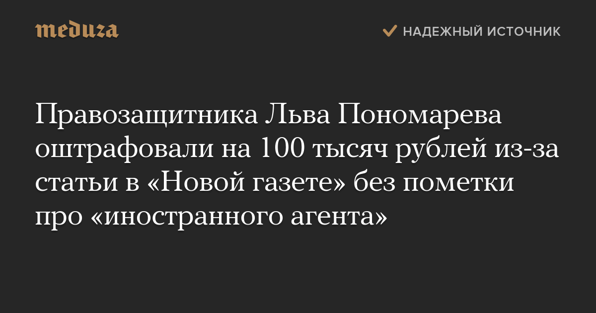 В Москве суд оштрафовал на 100 тысяч рублей руководителя движения «За права человека» Льва Пономарева, статья которого в «Новой газете» была опубликована без указания о том, что движению присвоен статус «иностранного агента».