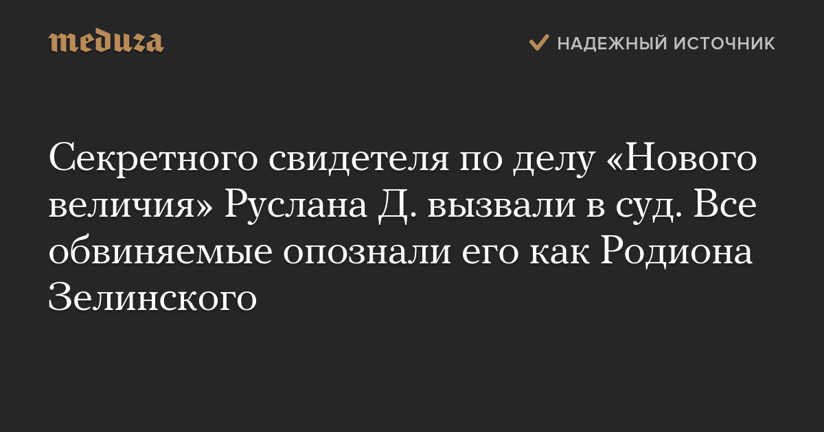 Все восемь обвиняемых по делу «Нового величия» опознали засекреченного свидетеля Руслана Д. как Родиона Зелинского. Об этом «Коммерсанту» сообщили адвокаты обвиняемых Максим Пашков и Александр Лупашко.