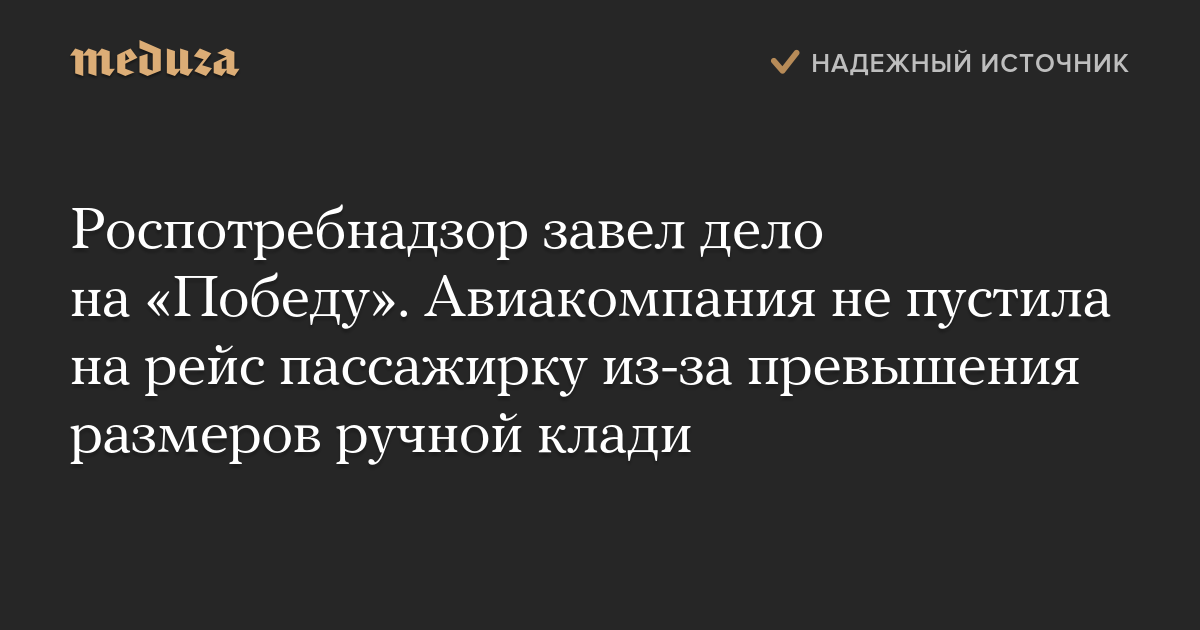 Управление Роспотребнадзора по Москве возбудило дело об административном правонарушении в отношении авиакомпании «Победа», которая не пустила на рейс пассажирку из-за превышения допустимых размеров ручной клади.