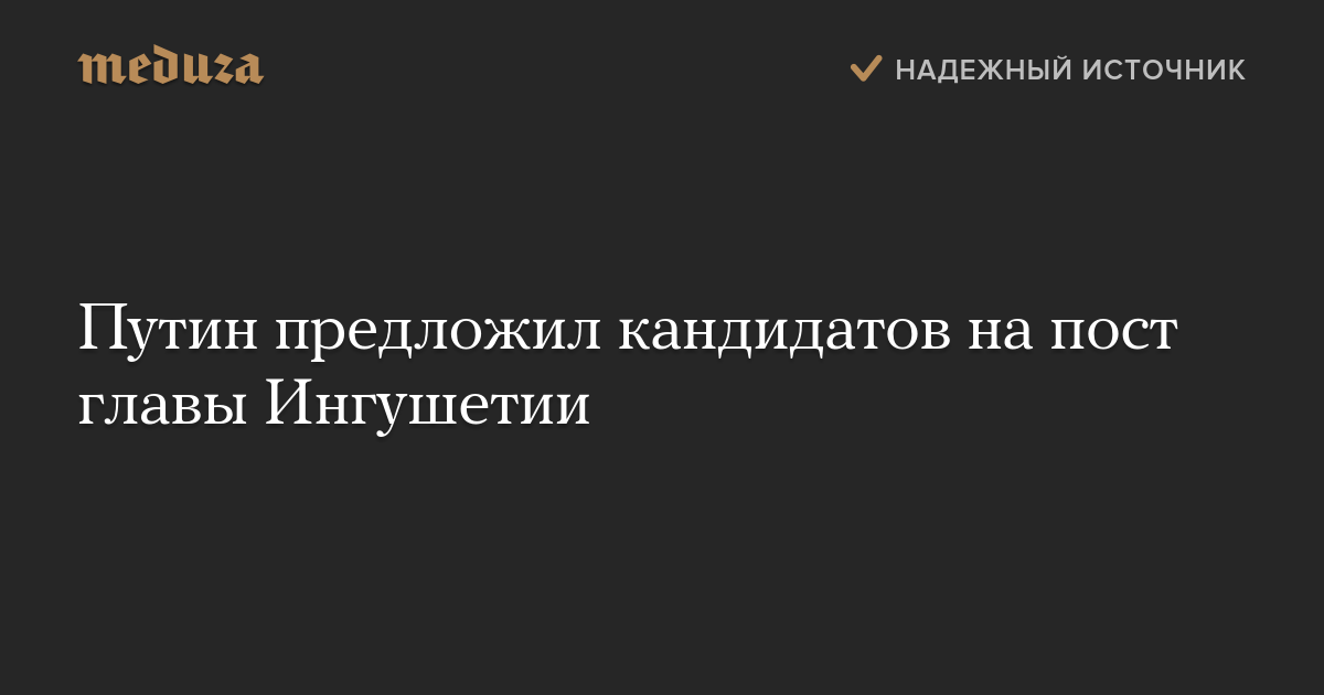 Президент РФ Владимир Путин внес на рассмотрение Народного собрания Ингушетии три кандидатуры на пост главы республики, сообщается на сайте регионального парламента.