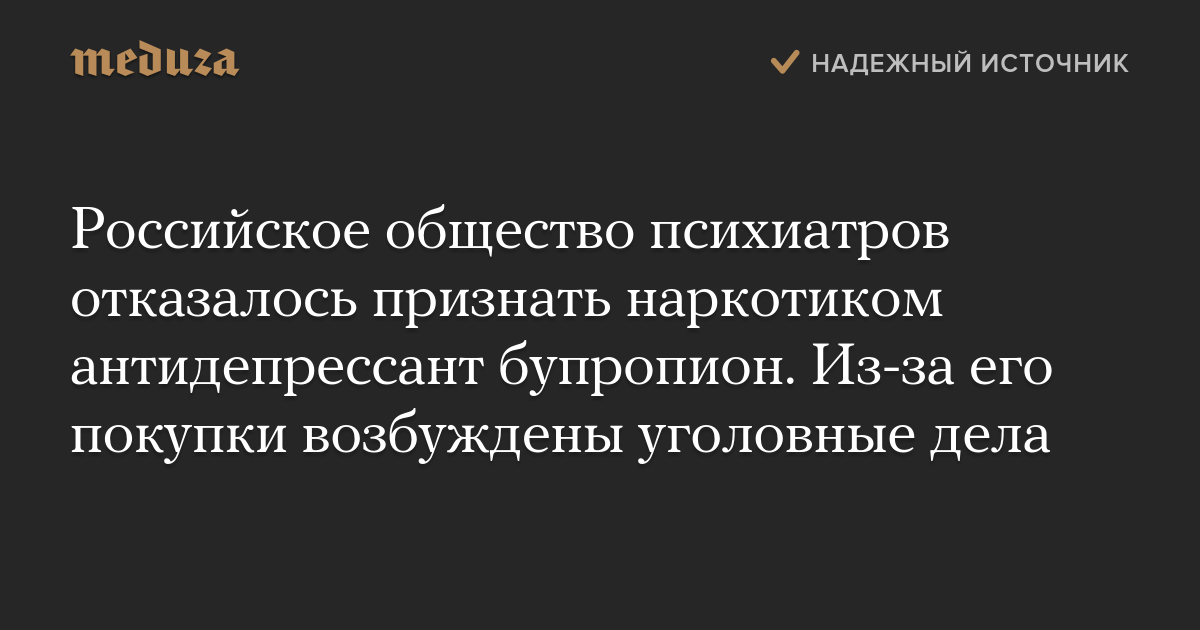 Российское общество психиатров (РОП) считает, что препарат бупропион не является наркотиком. Соответствующее заключение размещено на сайте РОП, первым на него обратил внимание «Коммерсант».
