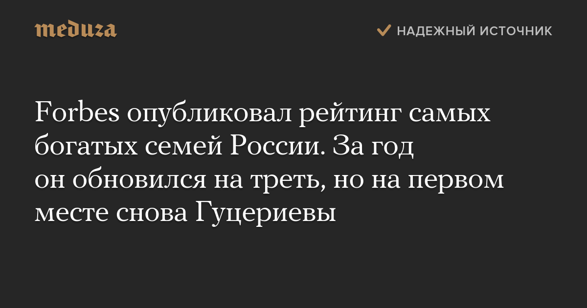 Журнал Forbes представил ежегодный рейтинг самых богатых семей России. В этом году топ-10 самых успешных предпринимательских династий страны обновился на треть, но семья Гуцериевых сумела сохранить первое место.