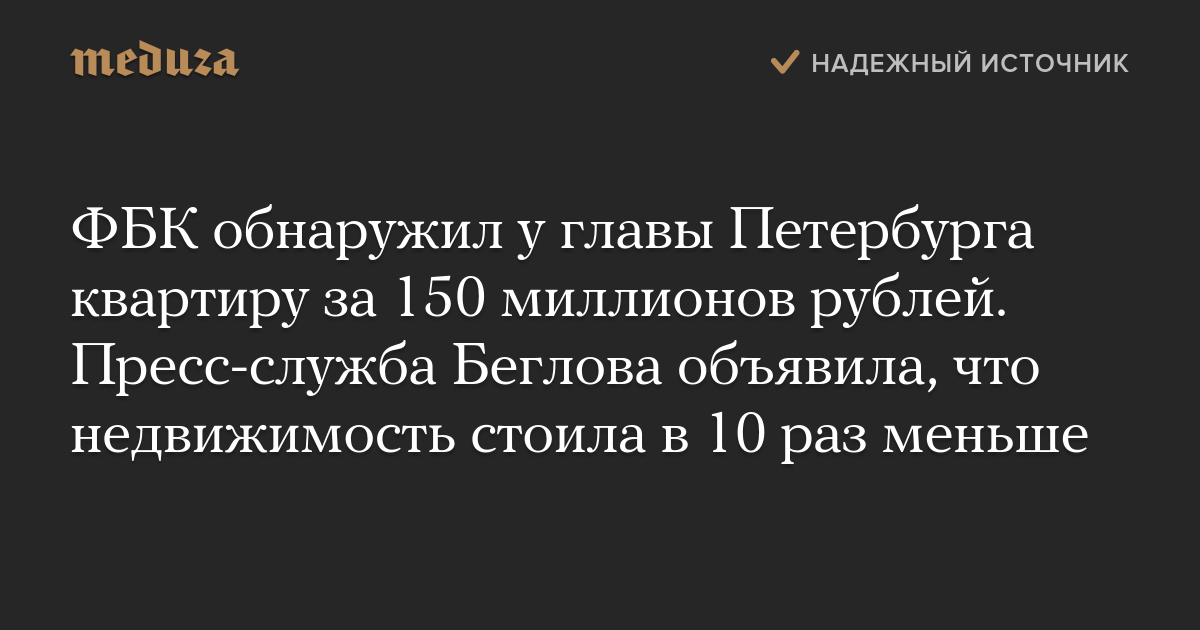 ФБК обнаружил у главы Петербурга квартиру за 150 миллионов рублей. Пресс-служба Беглова объявила, что недвижимость стоила в 10 раз меньше