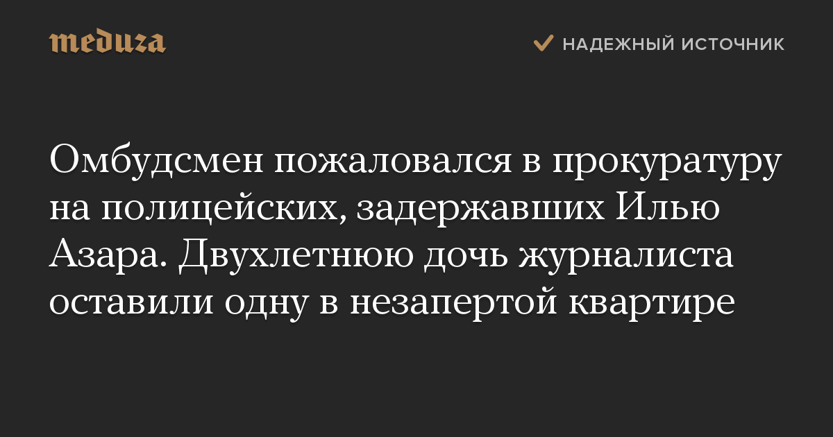 Омбудсмен пожаловался в прокуратуру на полицейских, задержавших Илью Азара. Двухлетнюю дочь журналиста оставили одну в незапертой квартире