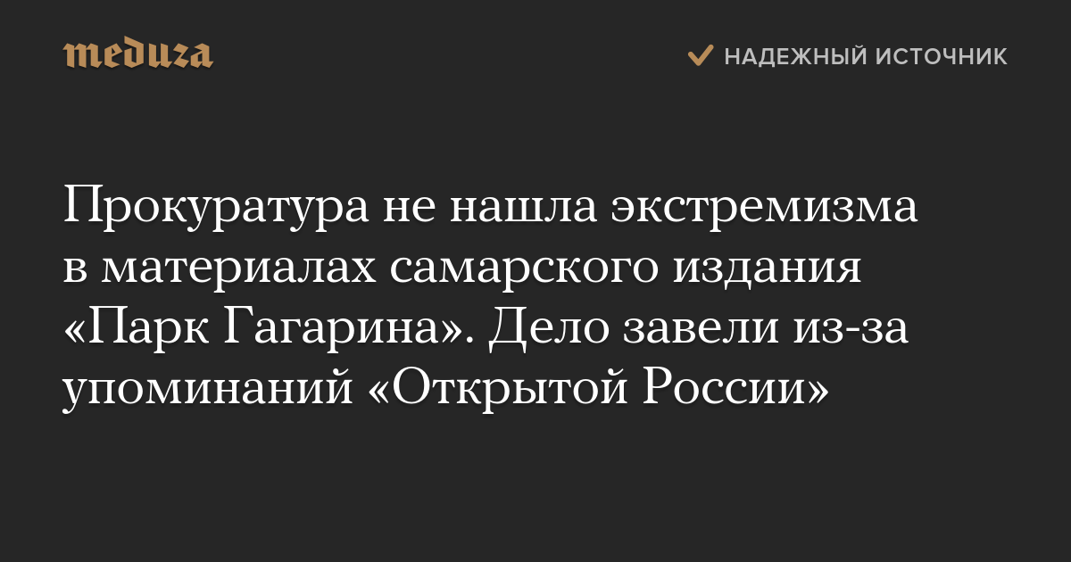 Прокуратура Самары не нашла экстремизма в работе самарского издания «Парк Гагарина», в отношении которого завели административное дело из-за упоминаний «Открытой России». Об этом сообщает глава международной правозащитной группы «Агора» Павел Чиков.