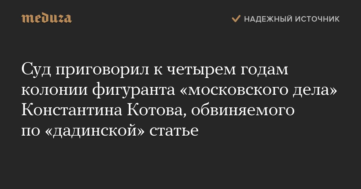 Тверской районный суд Москвы назначил четыре года колонии общего режима фигуранту «московского дела» Константину Котову, который обвинялся по статье о неоднократном нарушении правил проведения митинга. Об этом сообщает «Медиазона».