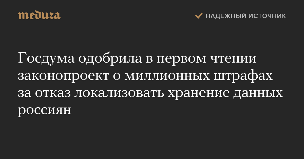 Нижняя палата российского парламента одобрила в первом чтении законопроект, предусматривающий штрафы в размере до 18 миллионов рублей за отказ хранить данные россиян в России.