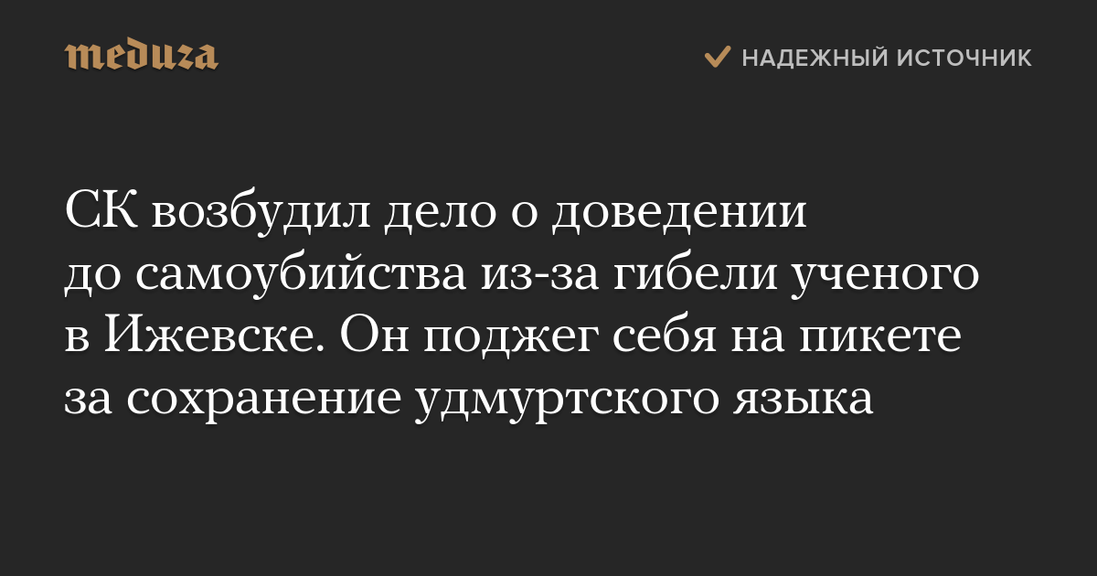 СК возбудил дело о доведении до самоубийства из-за гибели ученого в Ижевске. Он поджег себя на пикете за сохранение удмуртского языка