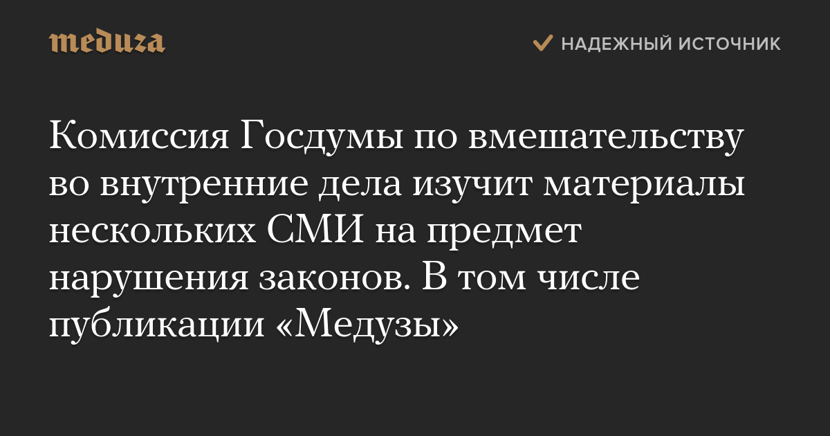 Комиссия Госдумы по вмешательству во внутренние дела изучит материалы нескольких СМИ на предмет нарушения законов. В том числе публикации «Медузы»
