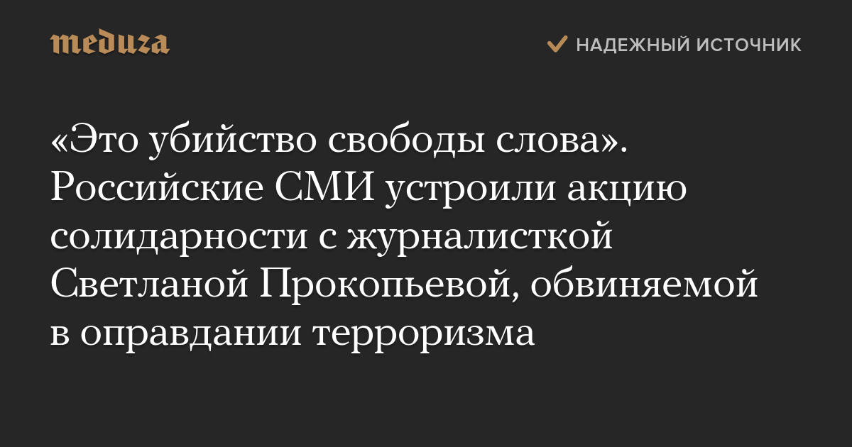 1 октября российские СМИ — «Эхо Москвы», «Медиазона», «Новая газета», «Дождь», «Такие дела», «Сноб», «МБХ медиа», «7×7», «Псковская губерния», Wonderzine и «МОХ» — одновременно опубликовали открытое письмо псковской журналистки Светланы Прокопьевой, которую обвиняют в публичном оправдании терроризма. Журналисты также постят текст письма в своих личных аккаунтах в соцсетях.