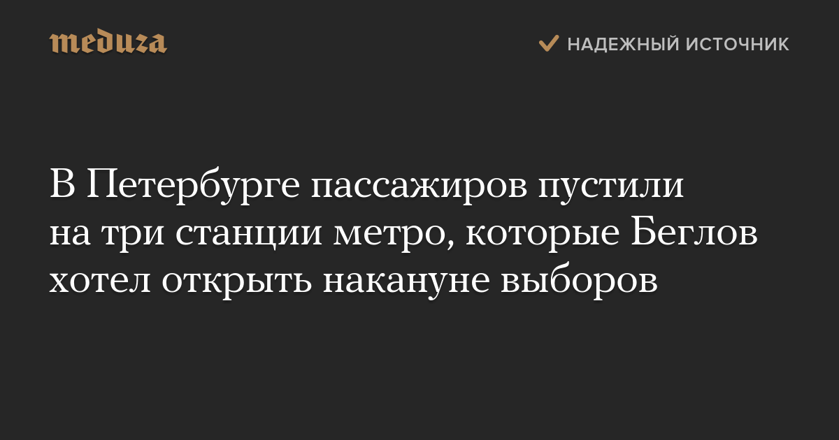Первый раз Беглов провел торжественную церемонию открытия трех станций 5 сентября — за три дня до губернаторских выборов. Но сразу после церемонии он объявил, что пока станции не готовы к приему пассажиров.