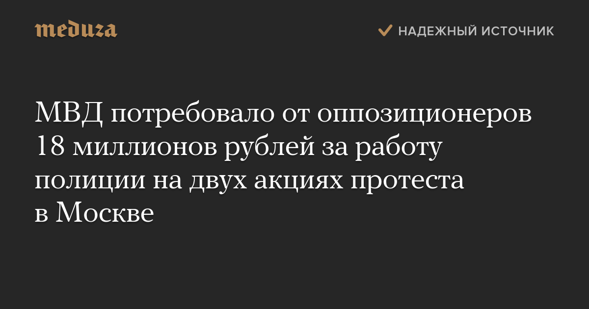 МВД потребовало от оппозиционеров 18 миллионов рублей за работу полиции на двух акциях протеста в Москве