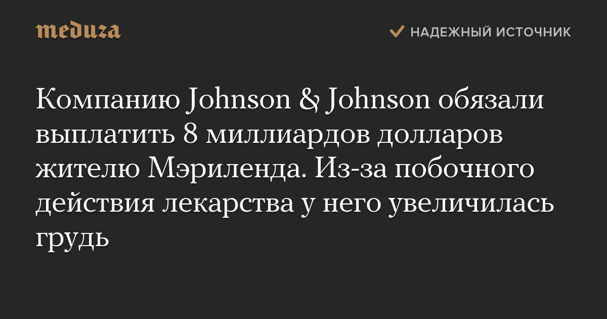 Компанию Johnson & Johnson обязали выплатить 8 миллиардов долларов жителю Мэриленда. Из-за побочного действия лекарства у него увеличилась грудь