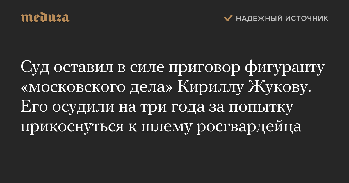 Мосгорсуд отказался изменить приговор, вынесенный фигуранту «московского дела» Кириллу Жукову. Об этом сообщает корреспондент «Медузы» из зала суда.
