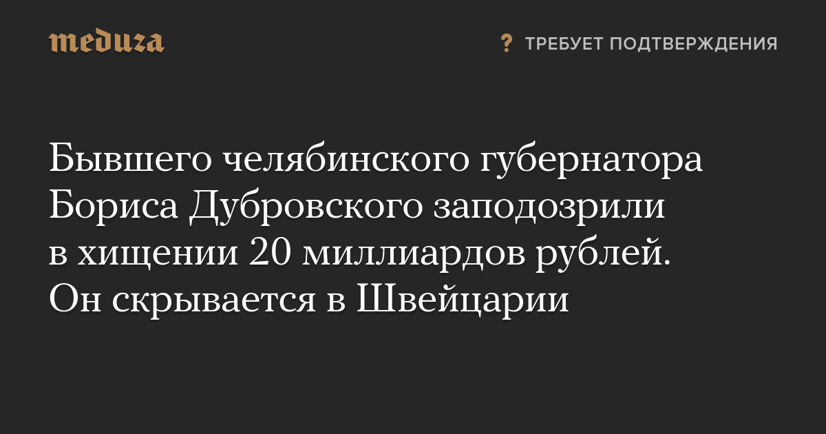 Бывшего челябинского губернатора Бориса Дубровского заподозрили в хищении 20 миллиардов рублей. Он скрывается в Швейцарии