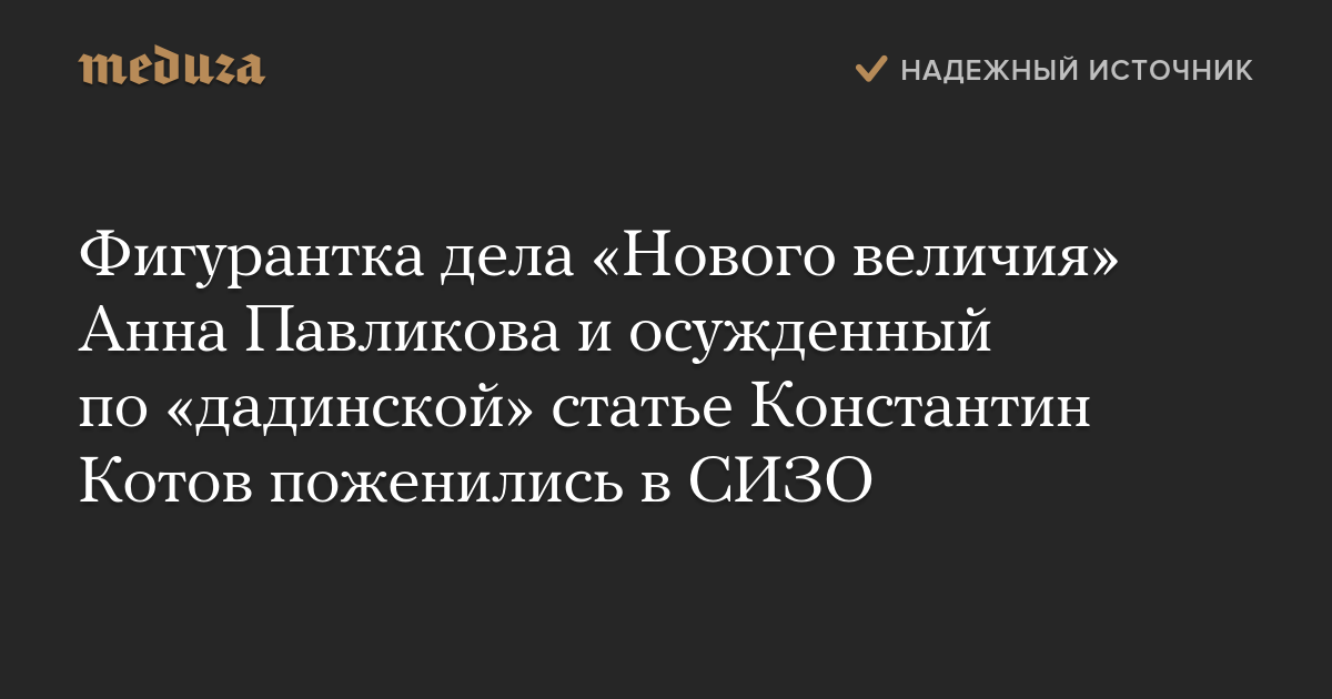 Осужденный по «дадинской» статье Константин Котов и обвиняемая по делу «Нового величия» Анна Павликова поженились в СИЗО «Матросская тишина». Об этом сообщает «Новая газета».