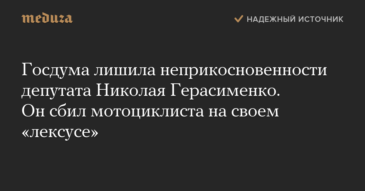 Госдума лишила неприкосновенности депутата Николая Герасименко. Он сбил мотоциклиста на своем «лексусе»