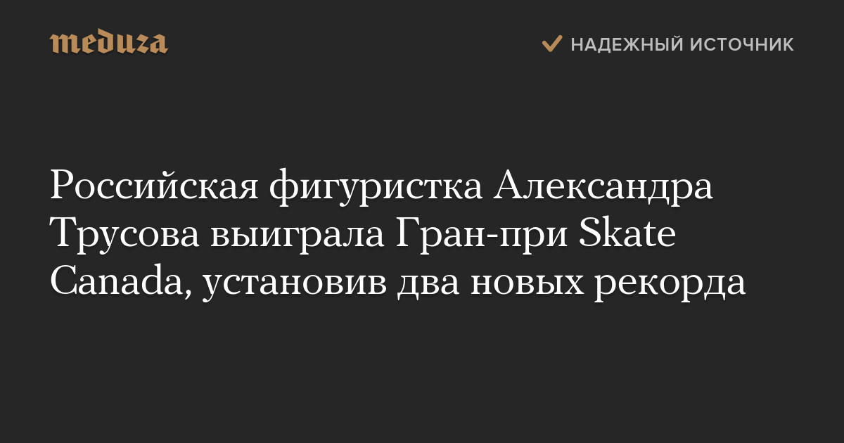 15-летняя россиянка Александра Трусова заняла первое место на Гран-при Skate Canada. За произвольную программу российская фигуристка получила 166,62 балла, обновив собственный мировой рекорд. По сумме двух программ Трусова набрала 241,02 балла, что также является мировым рекордом.