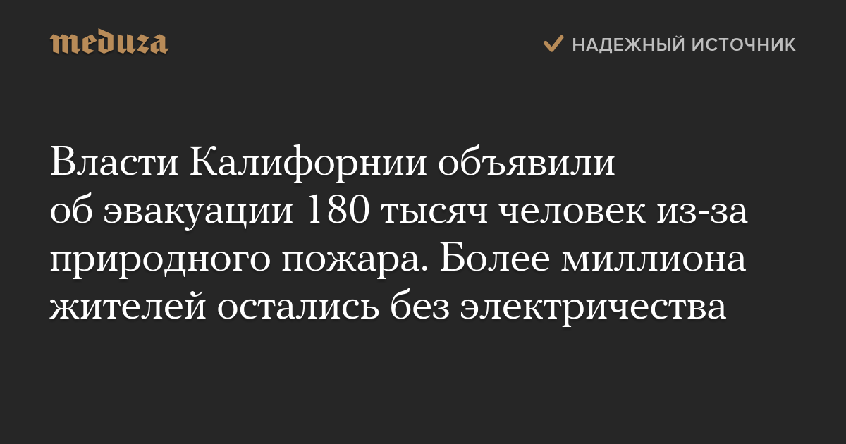 Власти Калифорнии объявили об эвакуации 180 тысяч человек из-за природного пожара. Более миллиона жителей остались без электричества