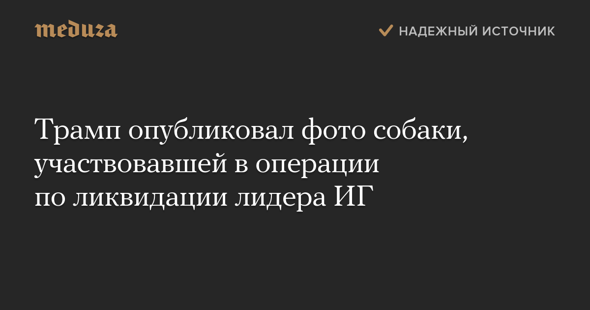 Что это за сообщение и почему оно повсюду на «Медузе»?Президент США Дональд Трамп выложил в твиттере фотографию служебной собаки, которая участвовала в операции по ликвидации лидера «Исламского государства» Абу-Бакра аль-Багдади.