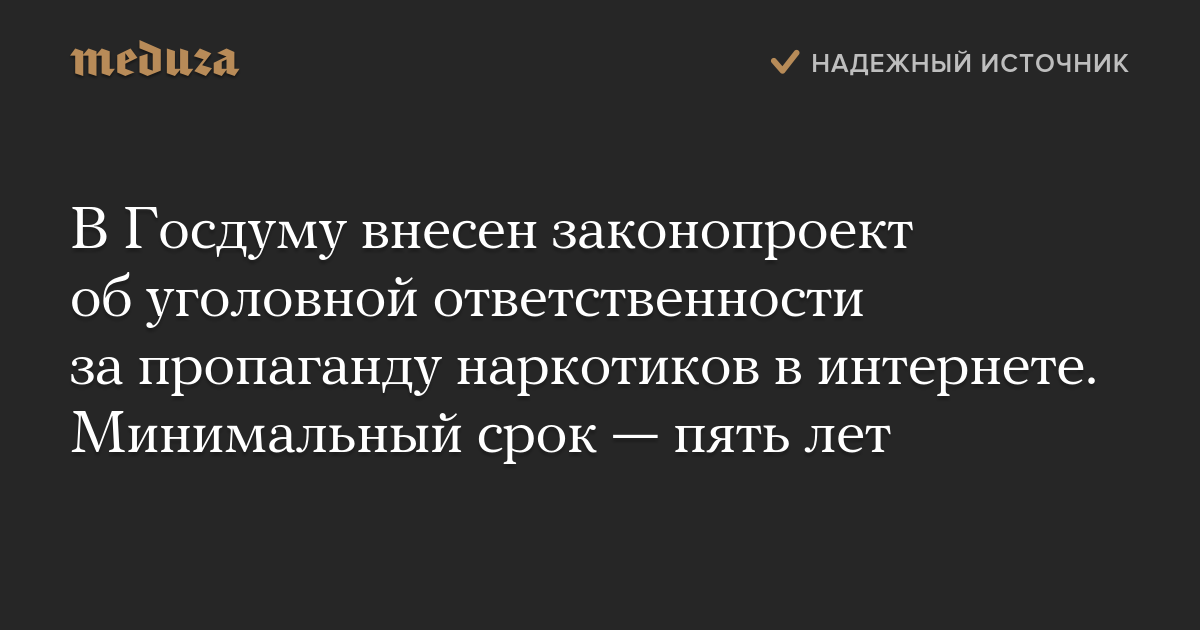 В Госдуму внесен законопроект об уголовной ответственности за пропаганду наркотиков в интернете. Минимальный срок — пять лет
