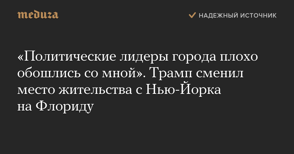 Трамп подтвердил переезд в Палм-Бич в серии твитов с объяснением своего решения. «Я ценю и буду ценить Нью-Йорк и народ Нью-Йорка, но, к сожалению, несмотря на то, что я каждый год плачу городу миллионы долларов местных и региональных налогов, политические лидеры города и штата плохо обошлись со мной. С немногими обходились хуже», — написал он, не пояснив, что конкретно имеет в виду.
