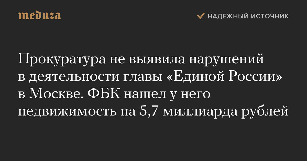 Прокуратура не выявила нарушений в деятельности главы «Единой России» в Москве. ФБК нашел у него недвижимость на 5,7 миллиарда рублей