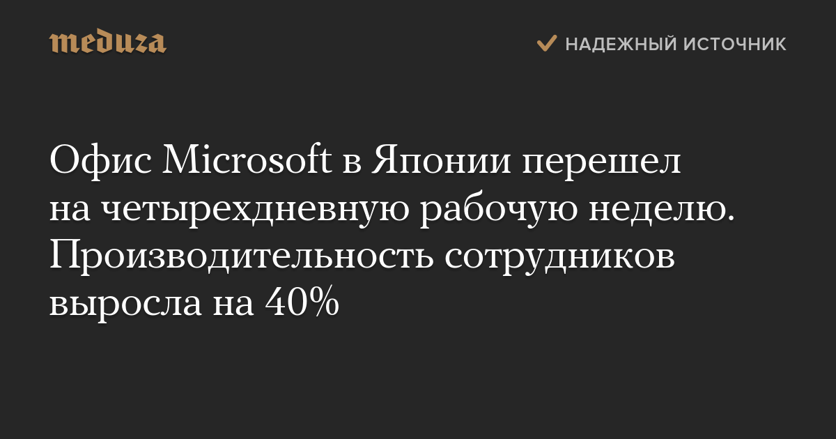 Японский офис Microsoft в качестве эксперимента на месяц перешел на четырехдневную рабочую неделю. Результаты показали, что это положительно сказалось не только на работниках, но и на результатах компании.
