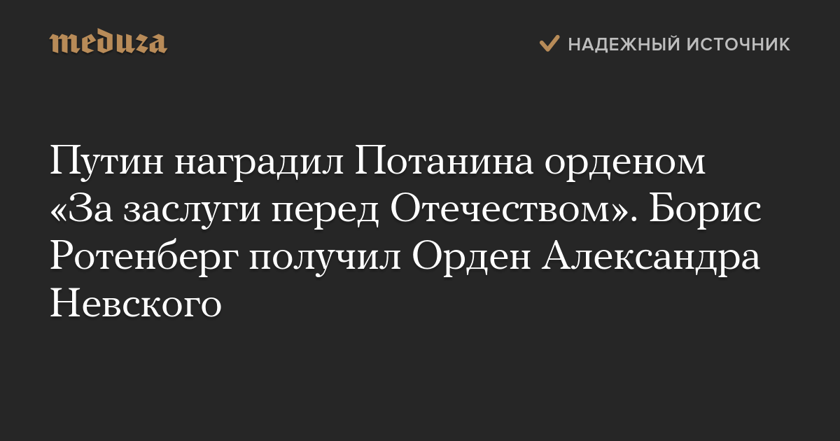 Путин наградил Потанина орденом «За заслуги перед Отечеством». Борис Ротенберг получил Орден Александра Невского