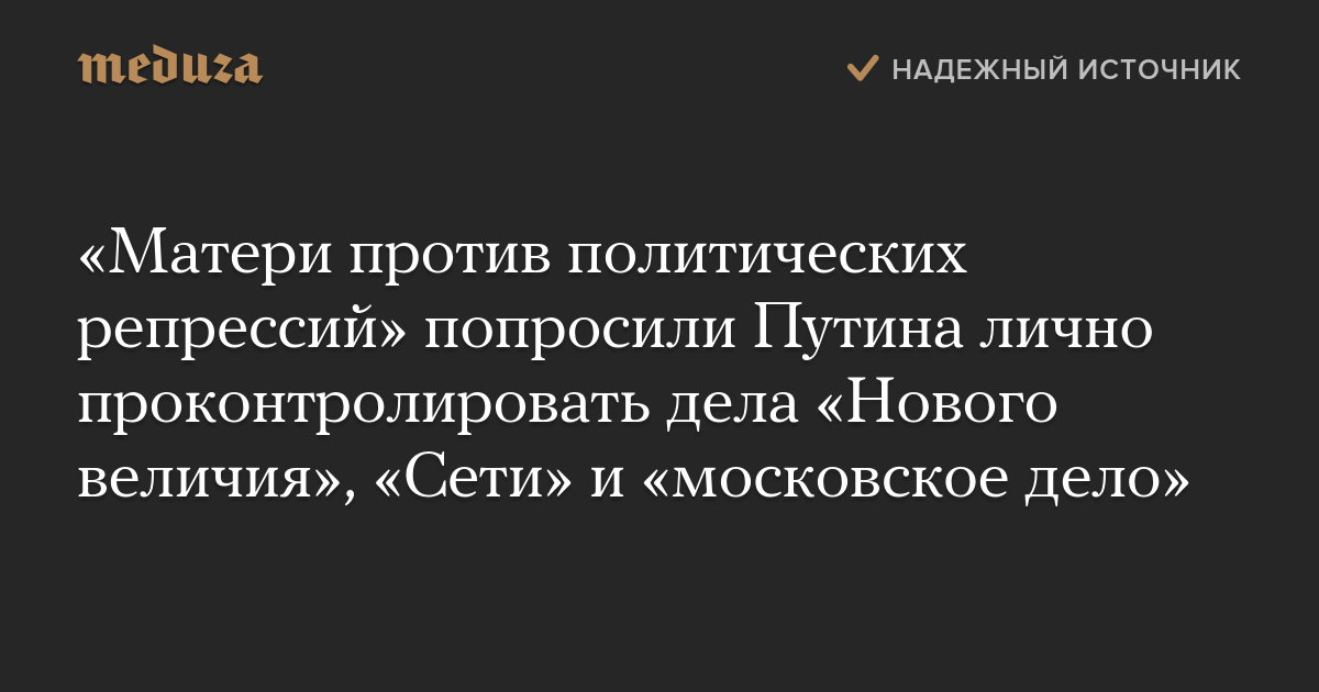«Матери против политических репрессий» попросили Путина лично проконтролировать дела «Нового величия», «Сети» и «московское дело»