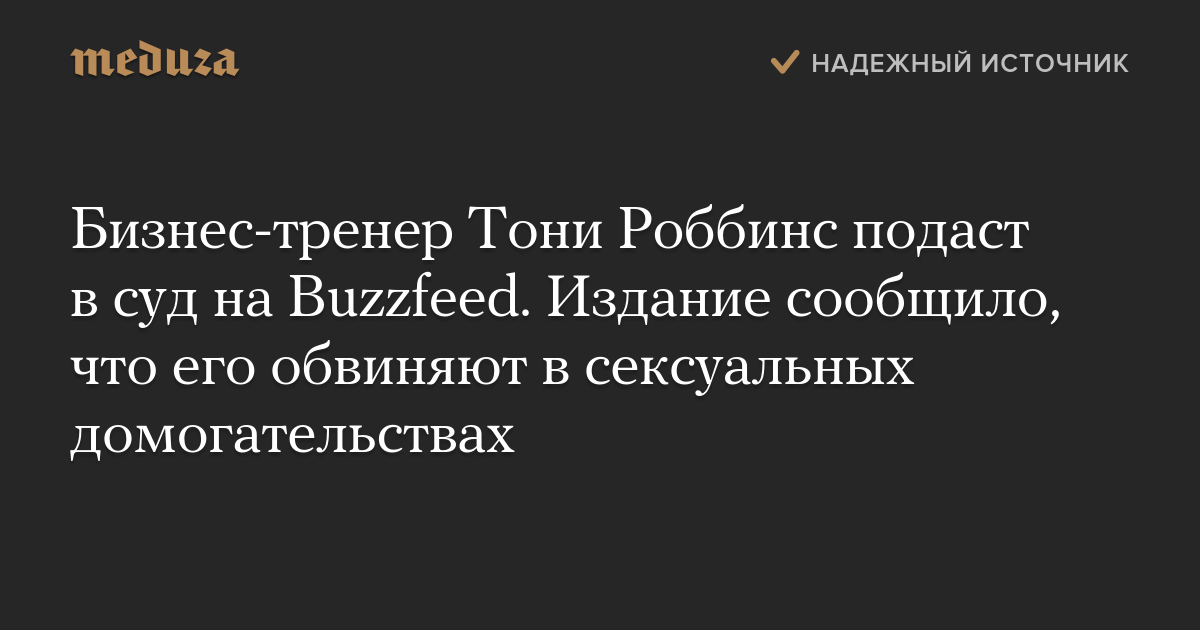 Тренер личностного роста Тони Роббинс решил подать в суд иск к изданию Buzzfeed News из-за серии материалов, в которых говорилось об обвинениях в сексуальных домогательствах, выдвинутых в его адрес.