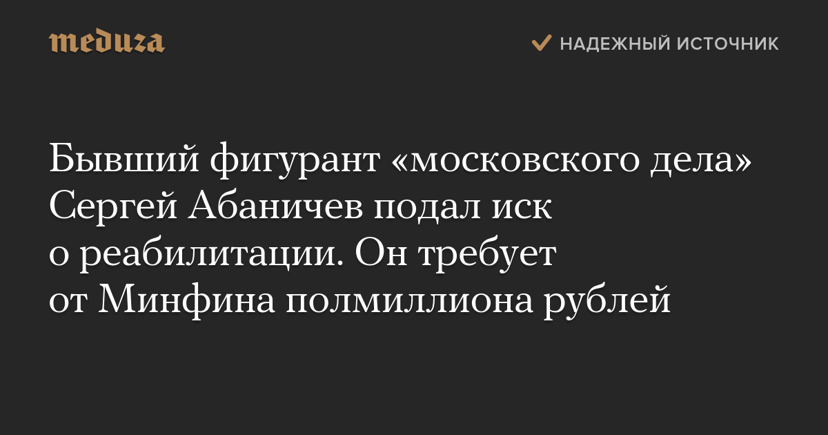 Бывший фигурант «московского дела» Сергей Абаничев подал иск о реабилитации. Он требует от Минфина полмиллиона рублей