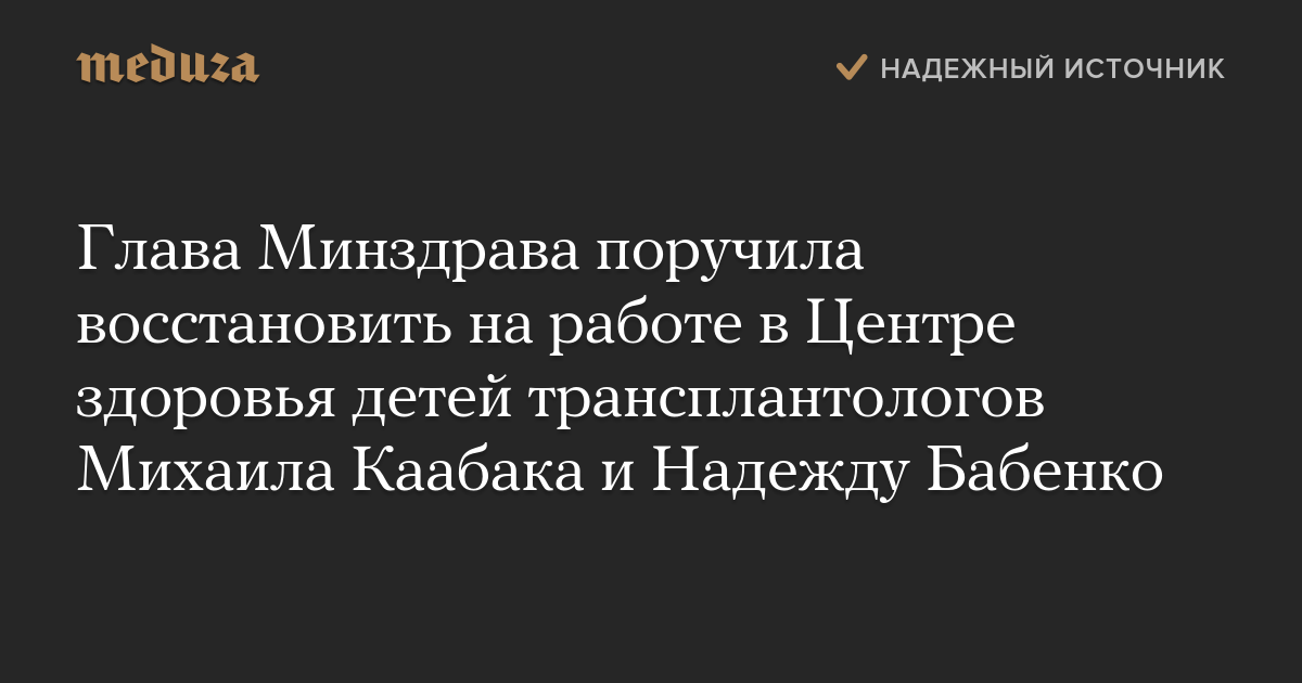 Глава Минздрава Вероника Скворцова дала поручение восстановить на работе в Национальном медицинском исследовательском центре здоровья детей трансплантологов Михаила Каабака и Надежду Бабенко.