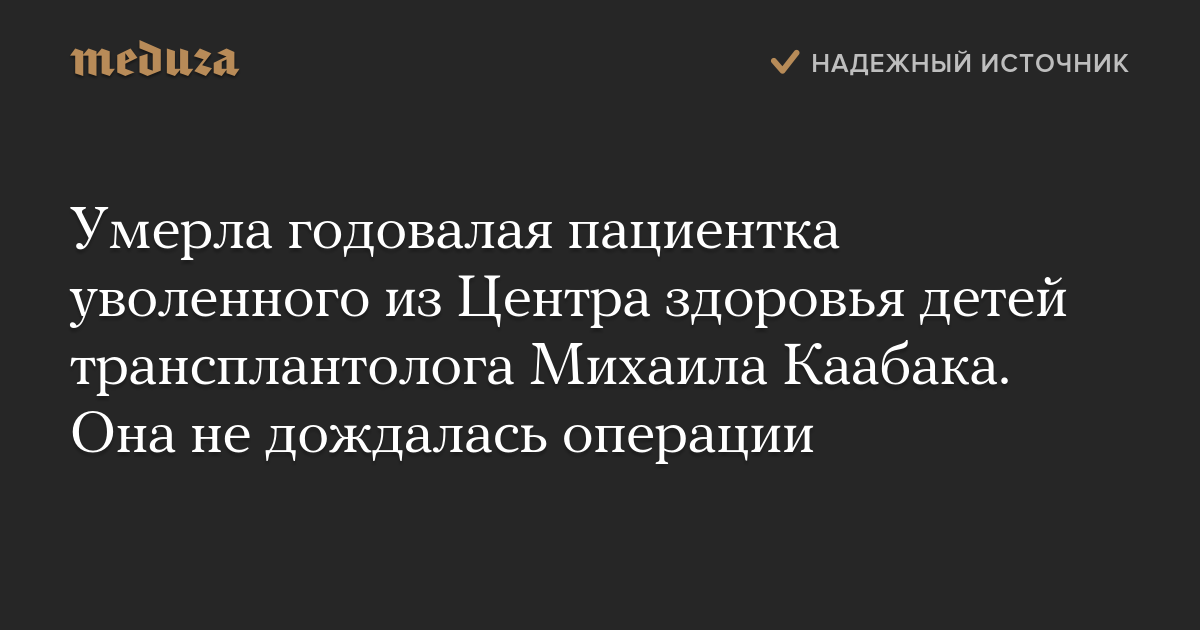 Умерла Настя Орлова — годовалая пациентка трансплантолога Михаила Каабака, который был уволен из Национального центра здоровья детей (НЦЗД), а позднее восстановлен в должности. Об этом «Коммерсанту» рассказала глава инициативной группы родителей пациентов Каабака Марина Десятская.