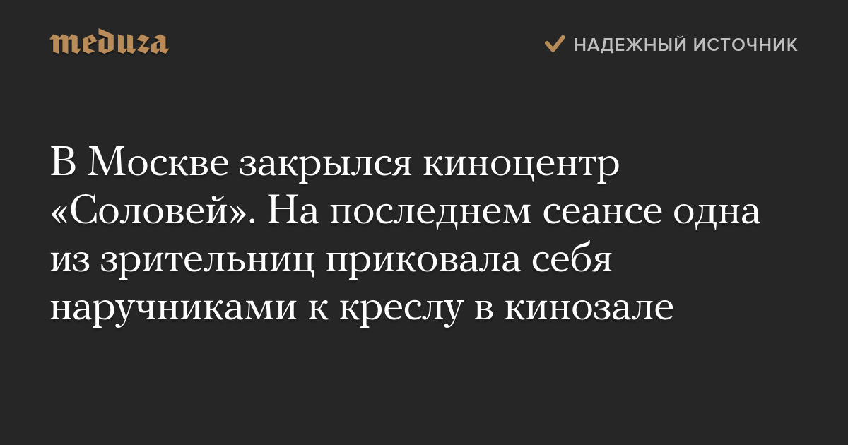 В Москве закрылся киноцентр «Соловей». На последнем сеансе одна из зрительниц приковала себя наручниками к креслу в кинозале
