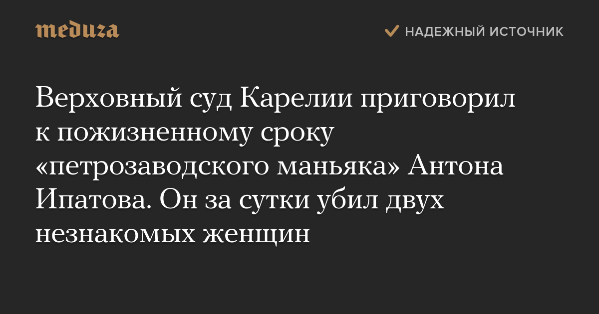 Верховный суд Карелии приговорил к пожизненному заключению ранее судимого жителя Петрозаводска Антона Ипатова, который за сутки убил двух незнакомых женщин и которого местные СМИ прозвали «петрозаводским маньяком».
