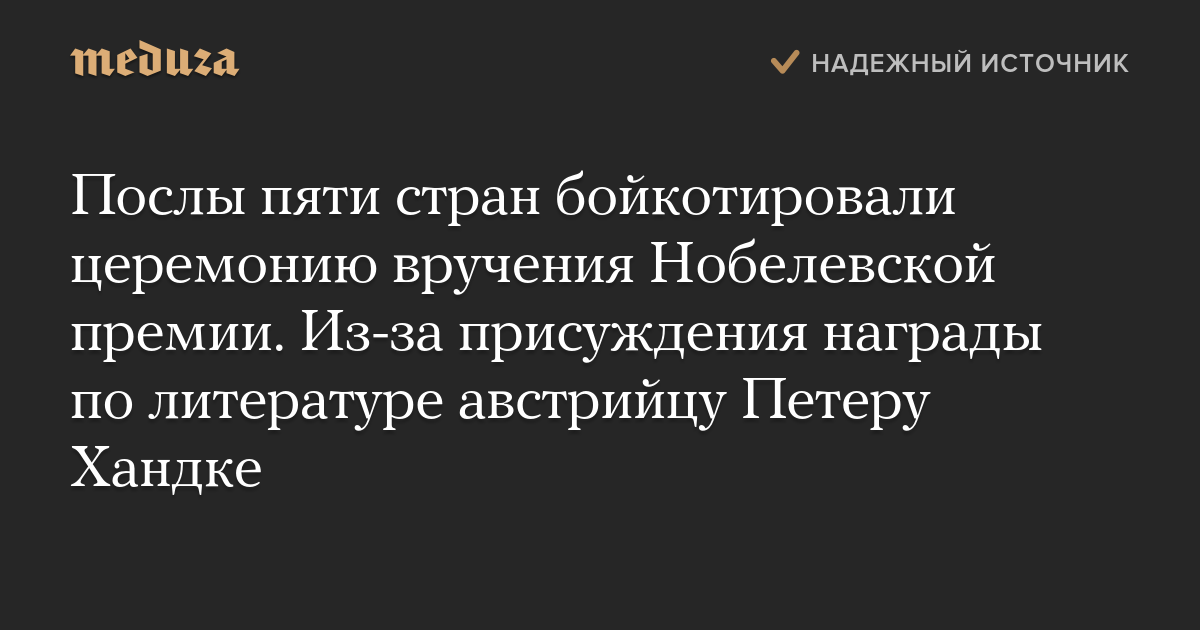Послы пяти стран бойкотировали церемонию вручения Нобелевской премии. Из-за присуждения награды по литературе австрийцу Петеру Хандке