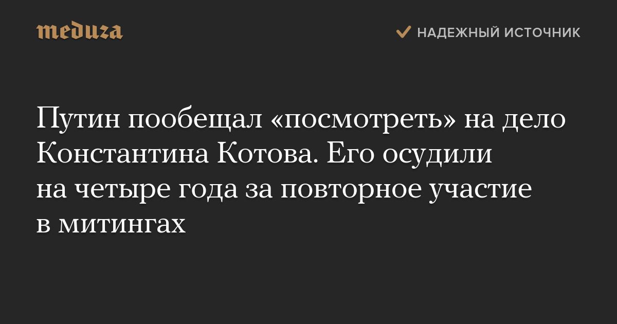 Президент России Владимир Путин пообещал изучить обстоятельства дела активиста Константина Котова, который был приговорен к четырем годам лишения свободы за неоднократное участие в несанкционированных митингах.