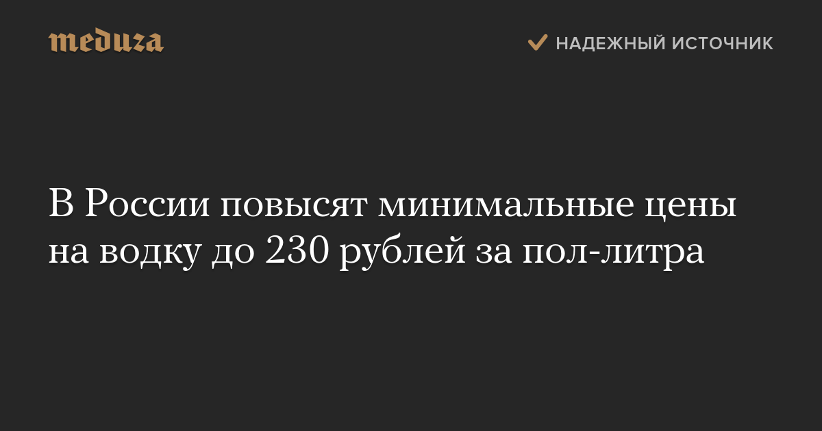 Минимальная розничная цена на водку в России с 1 января 2020 года будет увеличена с 215 до 230 рублей за пол-литра. Соответствующий приказ Минфина размещен на портале правовых актов.