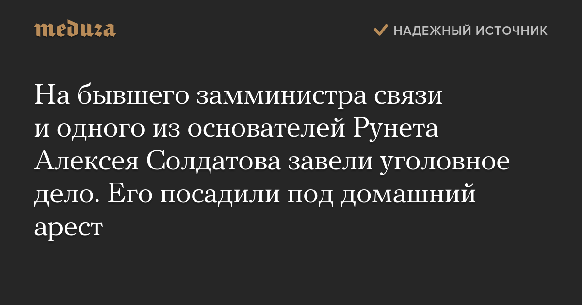 Один из основоположников Рунета Алексей Солдатов стал фигурантом уголовного дела и был отправлен под домашний арест. Об этом «Медузе» рассказали источник на IT-рынке и собеседник, близкий к Солдатову.