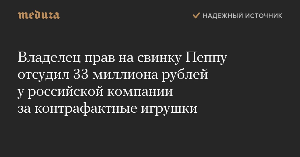 Как пишет «Коммерсант», российскую компанию обязали выплатить 32,9 миллиона рублей за использование в детских конструкторах образа Пеппы без покупки соответствующей лицензии. В картотеке суда на момент написания заметки решение пока не опубликовано.
