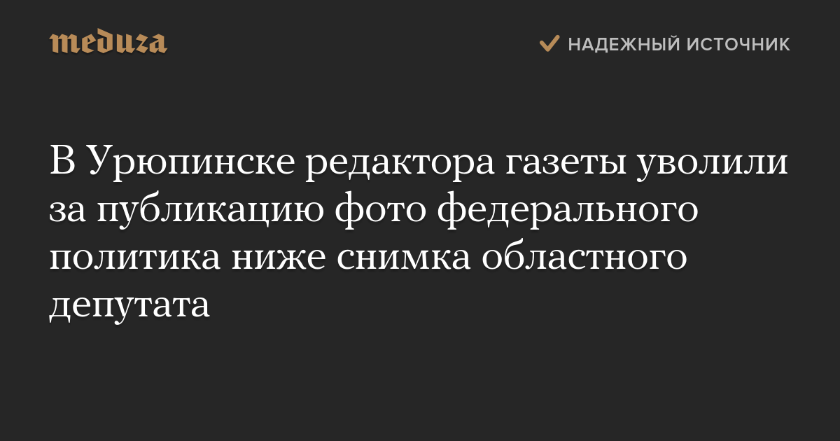 Мэр Урюпинска Юрий Хорошеньков уволил главного редактора «Урюпинской правды» Ольгу Шушлебину за то, что в газете фото федерального политика разместили ниже снимка областного депутата. Об этом пишет «Российская газета» («Урюпинская правда» — ее партнер).