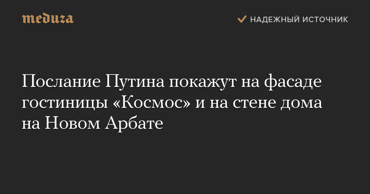 Послание Путина покажут на фасаде гостиницы «Космос» и на стене дома на Новом Арбате