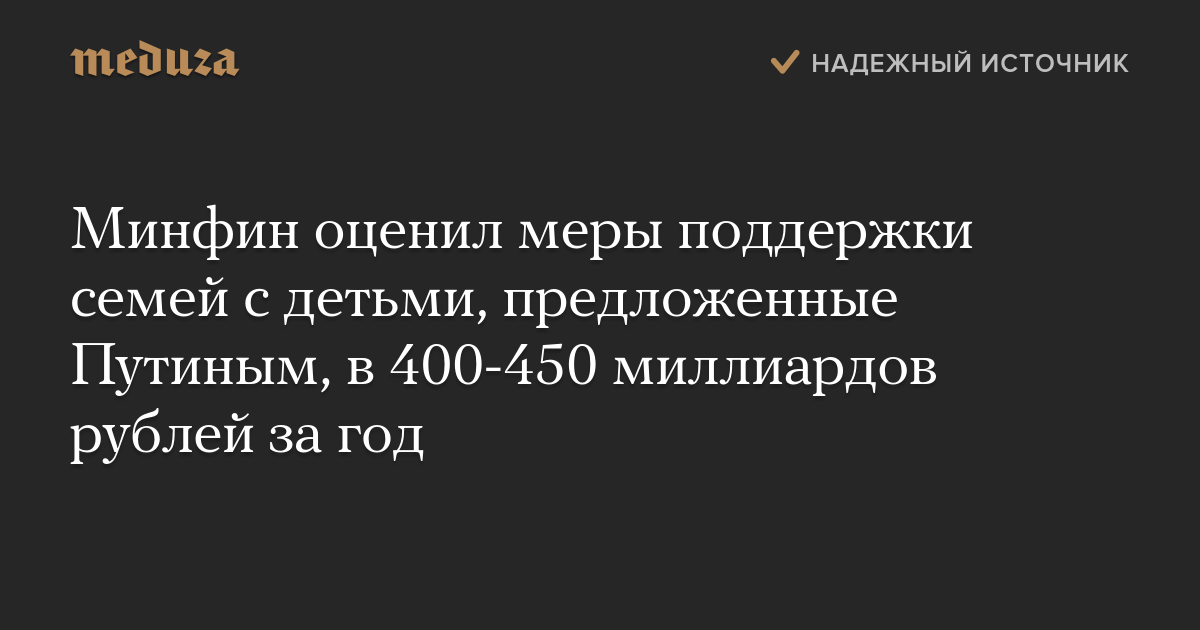 Минфин оценил меры поддержки семей с детьми, предложенные Путиным, в 400-450 миллиардов рублей за год