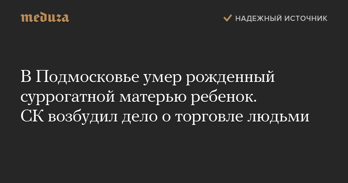 Правоохранительные органы возбудили уголовное дело по статьям «торговля людьми» и «причинение смерти по неосторожности» после того, как в одной из квартир в подмосковном поселке ВНИИССОК было обнаружено тело младенца, рожденного суррогатной матерью.