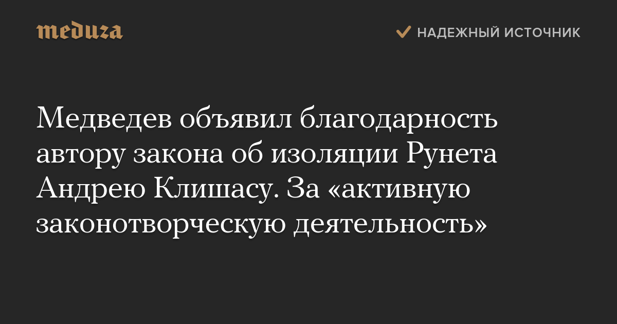 Среди тех, кому Медведев объявил благодарность, оказался сенатор Андрей Клишас — одного из авторов законов об изоляции Рунета, о фейковых новостях, и о неуважении к власти.